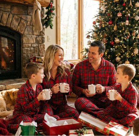 Click to Copy & Paste ⬇️Photorealistic Christmas morning: happy family in matching red plaid pajamas, cozy by fireplace and decorated tree, holding hot cocoa, warm sunlight, joyful smiles, 4K detailed.