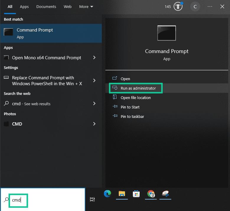 In the taskbar's search bar, type "cmd." From the search results, right-click Command Prompt and choose "Run as administrator."