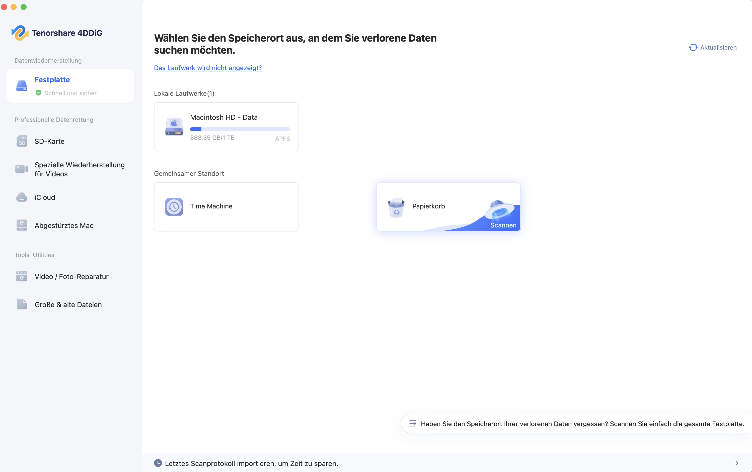 Starten Sie 4DDiG Data Recovery für Mac und wählen Sie den Ort aus, an dem Ihre Daten verloren gegangen sind, z. B. ein lokales Laufwerk oder einen üblichen Speicherort wie „Time Machine“ oder „Papierkorb“. Klicken Sie anschließend auf "Scannen", um den Vorgang zu starten. (Für externe Laufwerke stellen Sie bitte sicher, dass diese mit Ihrem Mac verbunden sind.)
