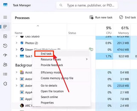 Schließen Sie ARC Raiders vollständig. Öffnen Sie den „Task-Manager“ und stellen Sie sicher, dass das Spiel nicht mehr im Hintergrund läuft. Falls doch, klicken Sie mit der rechten Maustaste auf den Prozess und wählen Sie „Task beenden“.