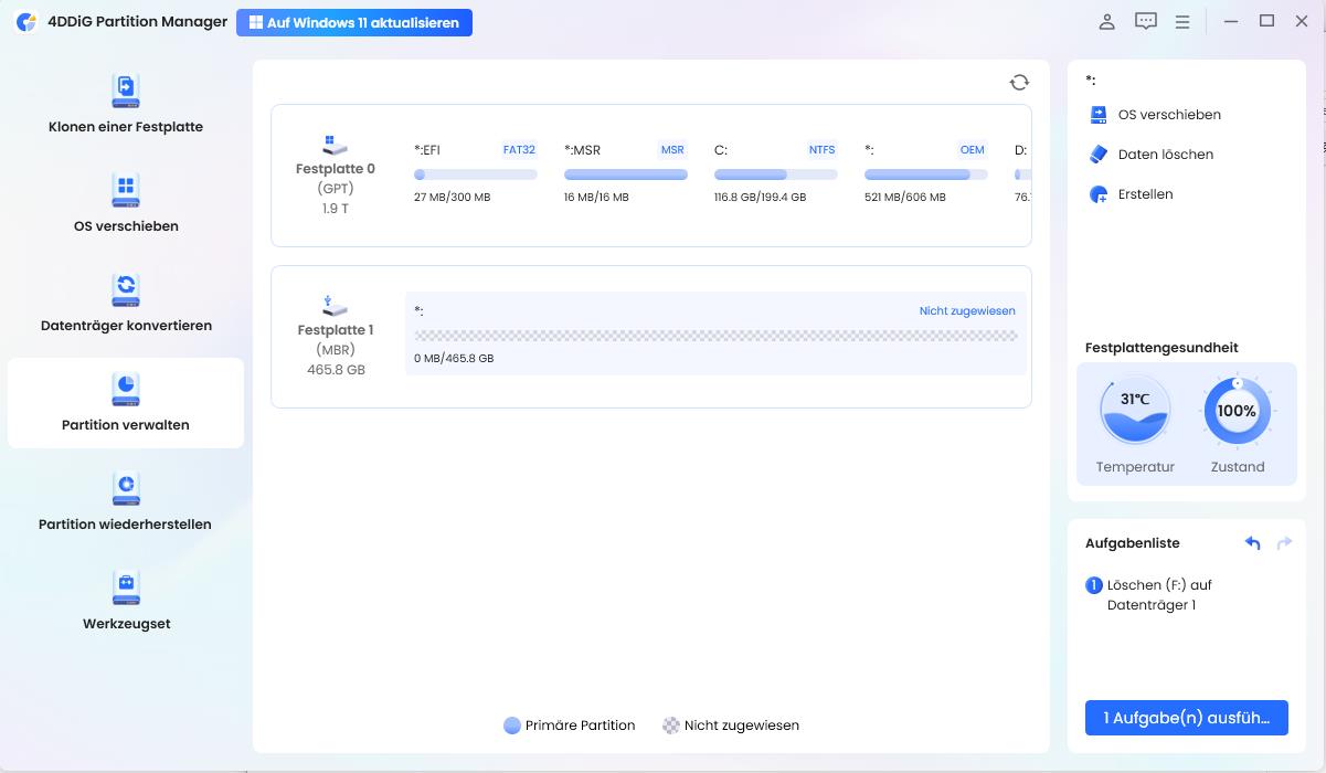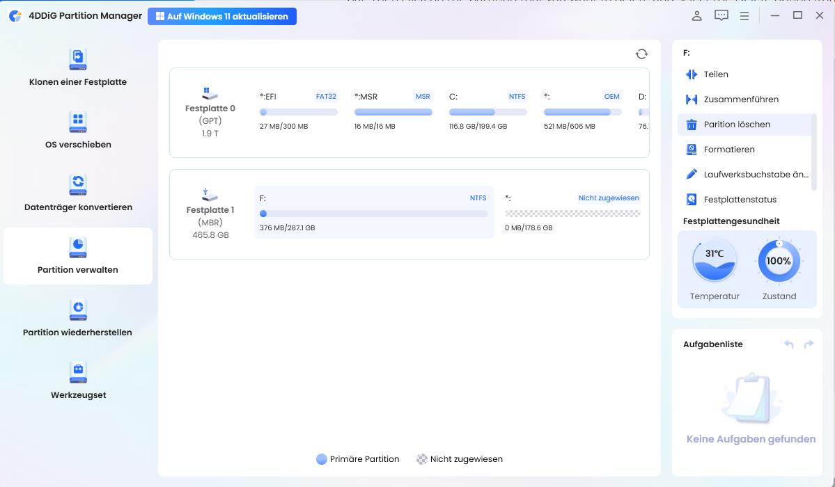 Weg 1. Verwenden Sie 4DDiG Partition Manager ganz ohne Datenverlust