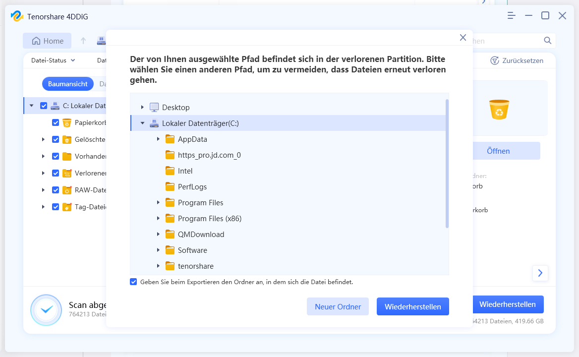 4DDiG fragt nach einem Speicherort, wählt einen geeigneten Speicherort aus und stellt ihn wieder her. Nachdem der Vorgang abgeschlossen ist, beenden Sie das Programm.