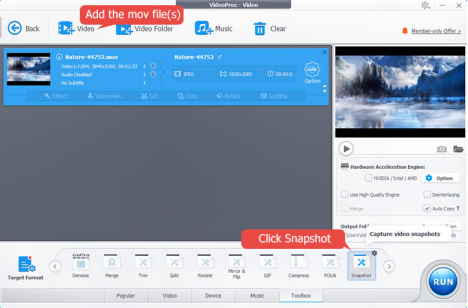 Klicke auf „Toolbox“. Doppelklicke auf „Snapshot“, um das Panel für Video-Schnappschüsse zu öffnen. Wähle „JPEG (.jpg)“ als Bildformat aus.