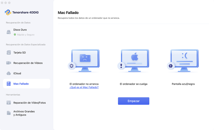 Tenorshare 4DDiG Mac le permite recuperar archivos perdidos tanto de Mac como de discos externos con facilidad. En casos de fallos del sistema o fallos de inicio, aún puede acceder y restaurar sus datos valiosos.