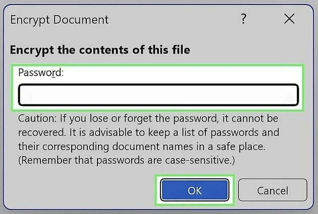 Delete the existing password from the dialog box and click “OK. Finally, save the document to apply the changes.