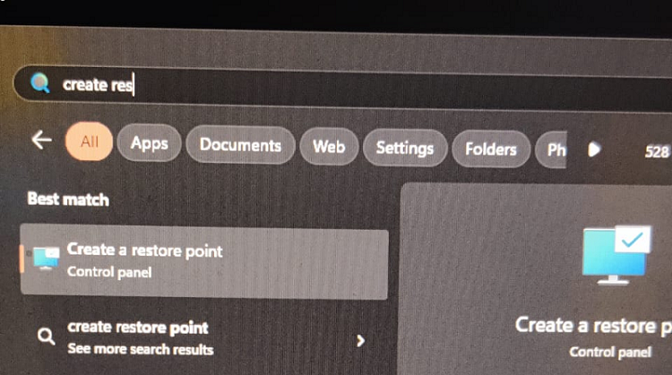 Open the System Properties dialog by using the Start menu search and typing "Create a restore point."