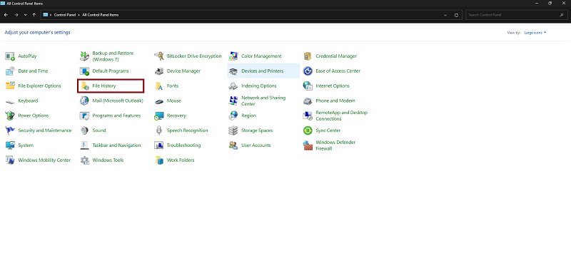 Locate the Control Panel on your computer and click on the icon that says "File History."