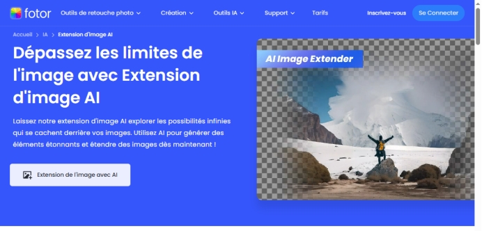 Fotor propose un outil spécialement conçu pour étendre les bords de vos images avec son système d'extension d'image IA, idéal pour les utilisateurs cherchant à ajuster leurs images pour différentes plateformes.
