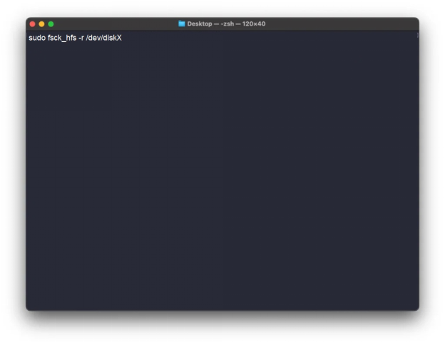 Tapez la commande sudo fsck_hfs -r /dev/diskX (remplacez X par le numéro de votre disque dur) et appuyez sur Entrée.