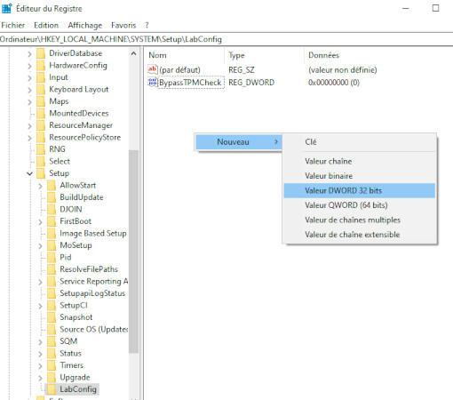 Dans LabConfig, ajoutez les valeurs DWORD suivantes : Cliquez avec le bouton droit dans le volet de droite, choisissez Nouveau > Valeur DWORD (32 bits) et créez ce qui suit :