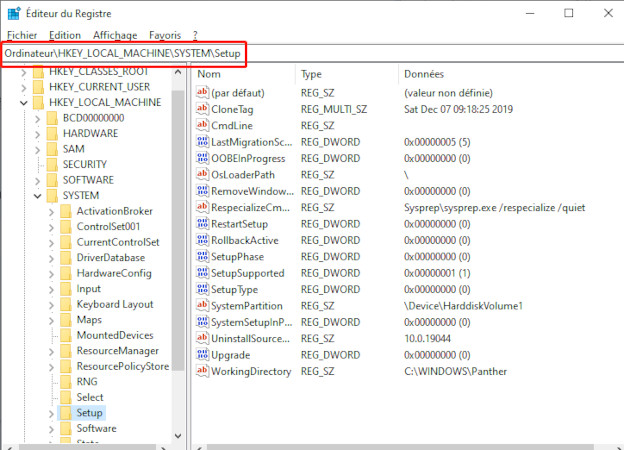 Accédez au chemin du registre d'installation : Dans l'Éditeur du Registre, accédez à HKEY_LOCAL_MACHINE\SYSTEM\Setup