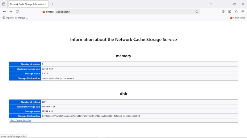 Firefox dispose d'une page interne qui affiche des informations sur le cache.