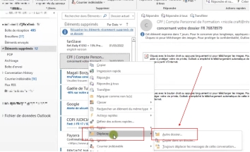 Cliquez avec le bouton droit de la souris sur le dossier Outlook que vous souhaitez récupérer et choisissez Déplacer.