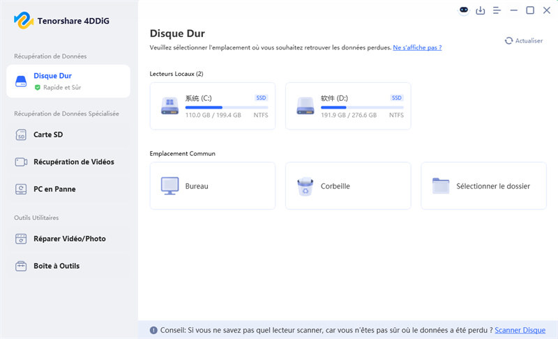 Si vous avez perdu des données importantes suite à l'erreur 0x80070422 ou tout autre problème lié à Windows 10, la bonne nouvelle est que vous pouvez récupérer vos fichiers grâce à des logiciels spécialisés comme Tenorshare 4DDiG. Ce logiciel est conçu pour récupérer facilement vos données perdues, que ce soit des photos, des vidéos, des documents, ou même des fichiers système. Il est fiable et offre une interface simple à utiliser, ce qui permet à tout utilisateur de restaurer ses fichiers sans trop de complications.