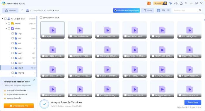 Le logiciel analysera le périphérique sélectionné pour trouver les fichiers supprimés. Une fois l'analyse terminée, vous pourrez prévisualiser les fichiers récupérables, y compris les vidéos. Sélectionnez les vidéos que vous souhaitez récupérer et cliquez sur "Récupérer" pour les restaurer.