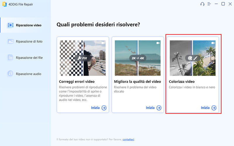 Non permettere ai tuoi preziosi ricordi di andare persi. Grazie alla funzione di colorazione di 4DDiG File Repair, puoi restituire ai tuoi vecchi video in bianco e nero il loro antico splendore. Questo strumento avanzato basato sull'intelligenza artificiale ti consente di aggiungere automaticamente colori naturali e realistici ai tuoi file video, ripristinando dettagli e texture che erano andati perduti. Segui i passaggi seguenti per imparare come colorare i tuoi video in bianco e nero con facilità e professionalità.