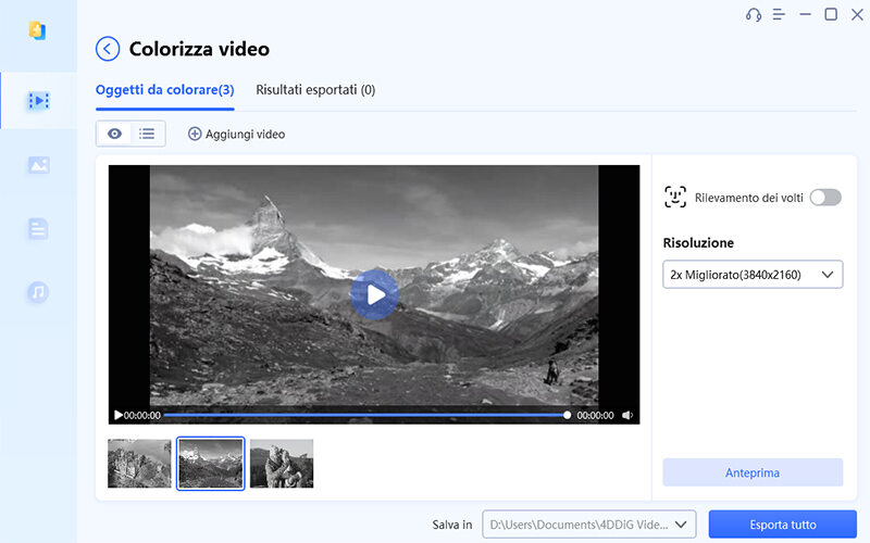 Una volta importato il video in bianco e nero, regola la risoluzione. Se il video presenta persone, puoi abilitare la funzione “Rilevamento dei volti”, progettata per rilevare i volti umani nei fotogrammi del video e preservare la tonalità naturale della pelle durante il processo di colorazione. Infine, fai clic sul pulsante [Anteprima].