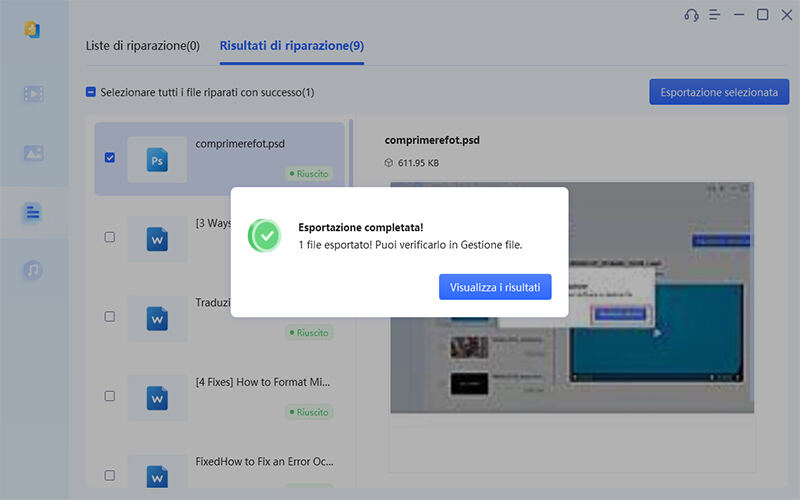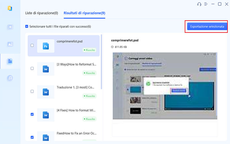 Dopo la conferma, selezionare i file riparati desiderati e fare clic sul pulsante "Esportazione Selezionata" per salvarli nella posizione preferita sul computer.