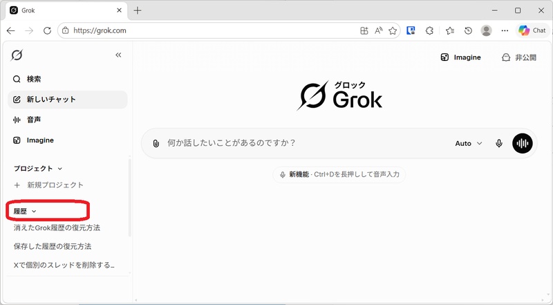grok.com(PCブラウザ): ログイン後、左サイドバーに会話が一覧表示されます。タイトルをクリックすると内容が開きます。