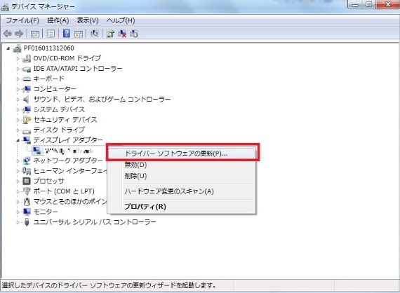 「ディスプレイアダプター」を展開し、お使いのグラフィックカードを右クリックして「ドライバーの更新」を選択します。