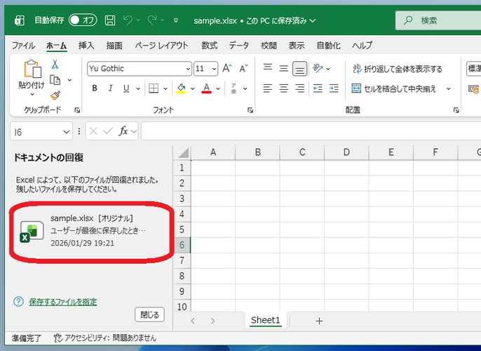 画面左側の「ドキュメントの回復」パネルを確認