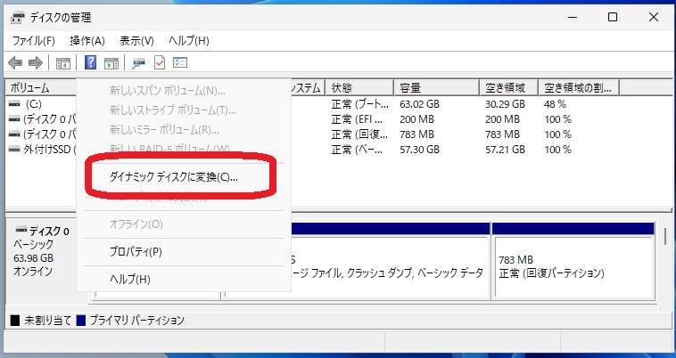 Windows標準ツールディスクの管理で完結する方法です。SSDをダイナミックディスクに変換する場合もHDDと手順は同じです。