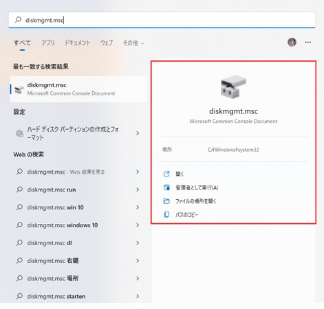 「diskmgmt.msc」と入力し「管理者として実行」を選択してください。