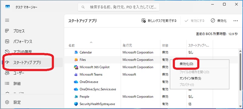 不要なプログラムを右クリックし「無効にする」を選択する