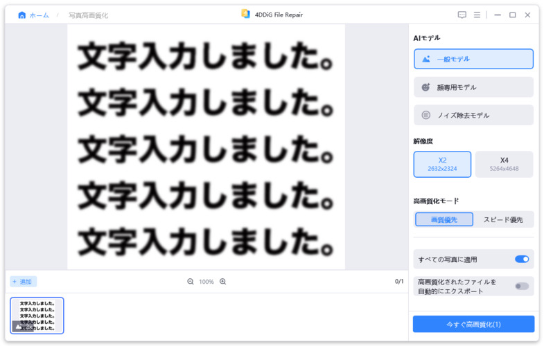 AIモデルと解像度を設定したら、「今すぐ高画質化」をクリックすると処理が始まります。完了後は、プレビューで画質の違いを確認できます。