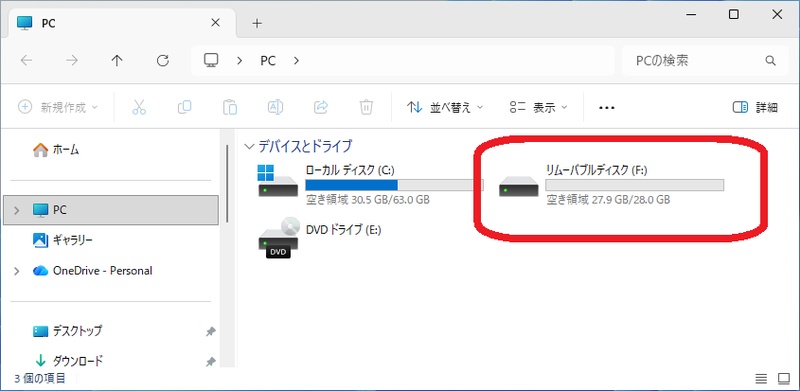 エクスプローラーで「リムーバブルディスク」として表示されることを確認