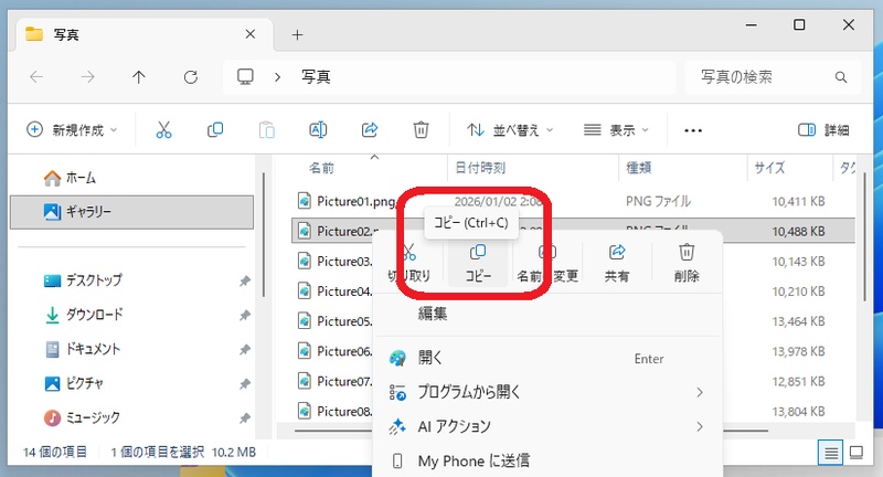 「ピクチャ」フォルダーを開き、移したいファイルを選択します。複数選ぶにはCtrlキーを押しながらクリック、または範囲をドラッグしてください。