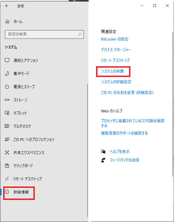 自動で復元ポイントを作る設定を適用する 「Windowsの設定画面」を開き、システムをクリックします。 すると、「システム」画面が表示されます。左の項目から、「詳細情報」をクリックしてください。ウィンドウの右の方に表示されている、「システムの保護」をクリックしてください。