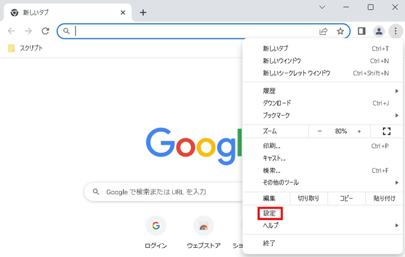 Chromeのメニューから「設定」を開きます。