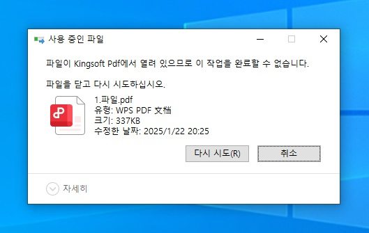 "파일이 사용 중입니다"라는 안내 창이 나타나면, 어떤 프로그램이 해당 파일을 사용 중인지 확인합니다.