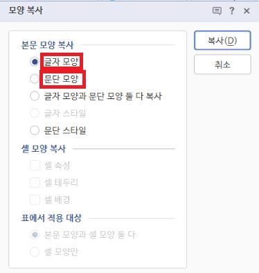 글자 모양과 문단 모양을 구분해서 복사하는 방법: