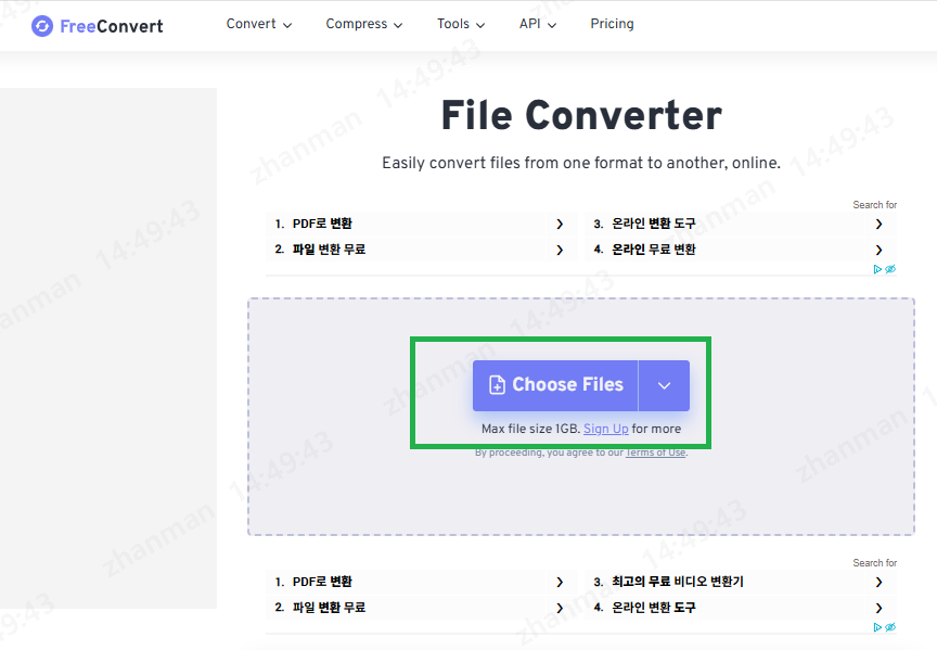 먼저 원하는 온라인 변환 사이트에 접속한 후, 화면에서 'Select/Choose Files' 버튼을 클릭하여 변환할 한글 파일을 선택하고 업로드합니다.