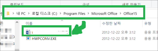 내 컴퓨터에서 C:\Program Files\Microsoft Office\Office15 경로로 이동합니다. 이 폴더 안에는 한글 파일 변환을 위한 유틸리티가 포함되어 있습니다. 여기서 “BATCHHWPCONV” 실행 파일을 더블 클릭해 실행합니다.