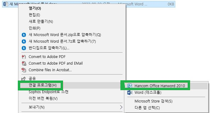 변환하려는 워드 파일을 마우스 오른쪽 버튼으로 클릭합니다. “연결 프로그램”에서 “Hancom Office Hanword 2010”을 선택해 해당 파일을 한글 프로그램에서 실행합니다.