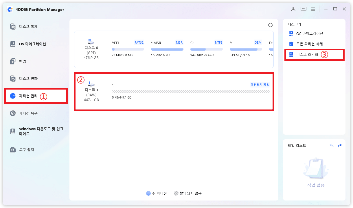 SSD 상태가 RAW이라면 먼저 SSD를 선택한 후 ‘디스크 초기화’를 클릭하고 디스크 형식 선택 > 작업 실행의 순서로 진행합니다.