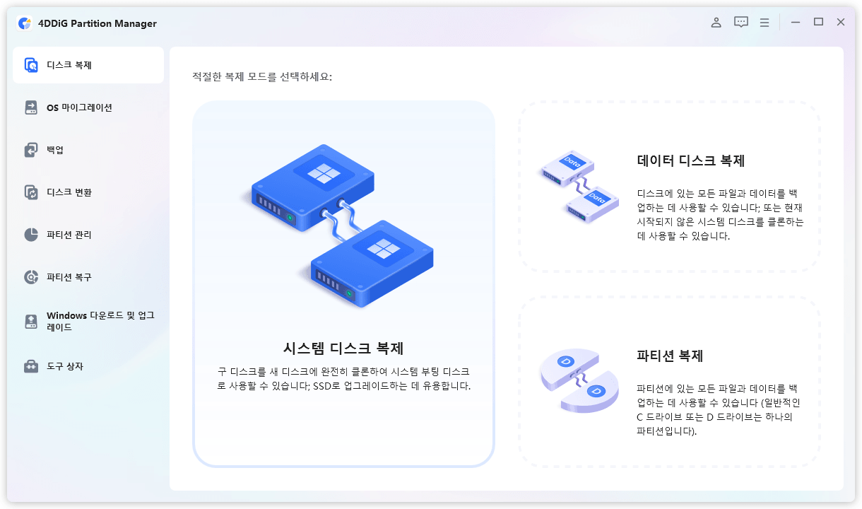 외장 디스크를 컴퓨터에 연결하고, 4DDiG Partition Manager를 다운로드하여 설치합니다. 그 후 애플리케이션을 실행하고, ‘시스템 디스크 복제’을 선택합니다.