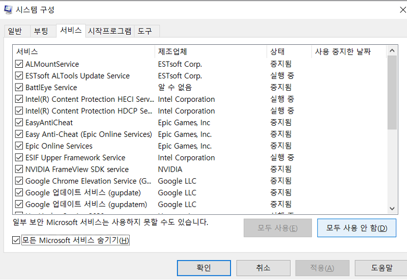 1단계 : 검색 상자에 msconfig를 입력하고 시스템 구성 > 서비스 > 모든 Microsoft 서비스 숨기기 를 선택하고, 모두 비활성화 합니다.