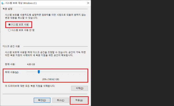 - 이제 두 가지를 선택해 주셔야 합니다. 먼저 상단의 "시스템 보호 사용" 옵션을 선택해 주세요. 그리고 하단의 디스크 공간 사용을 조절해 줘야 합니다. 원하시는 용량을 선택하시면 되는데, 보통 20% 정도가 적당합니다. 용량을 선택한 후에 "적용"을 클릭해 주세요.