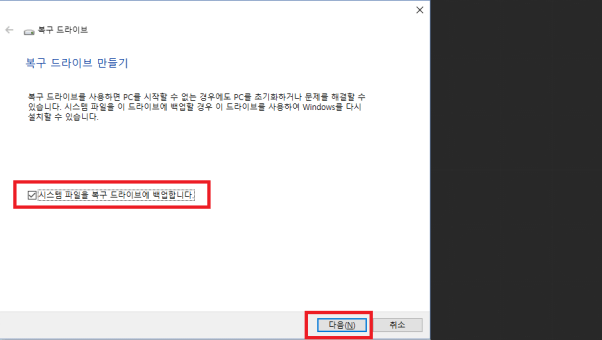 - '복구 드라이브 만들기' 화면에 진입했다면, 아래에 있는 체크박스: '시스템 파일을 복구 드라이브에 백업합니다'를 체크하고 "다음"을 클릭해 주세요.