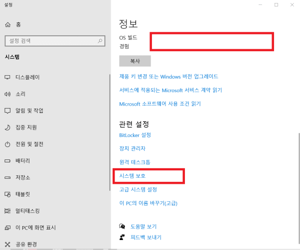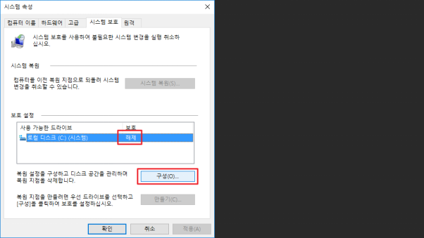 방법2. 시스템 복원 활성화 및 윈도우 10 복구 지점 설정하기