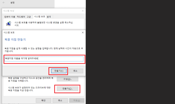 - 이제 윈도우 10 복구 지점을 만들어 봅시다. 다시 시스템 속성 창으로 돌아와서 하단의 "만들기"버튼을 클릭하면 됩니다. 그러면 "복원 지점 만들기" 창이 뜨게 되는데, 이곳에 여러분이 원하는 복원 이름을 입력하신 후에 "만들기"를 클릭하면 됩니다. 참고로 이 복원 이름은 여러분이 원하시는 대로 작성하셔도 무방합니다.