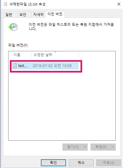 - 이전 버전의 파일이 존재하는 경우 아래와 같이 원하는 버전을 확인하고 원하고자 하는 버전을 클릭하고 확인 버튼을 눌러 복원을 진행합니다. 이전 버전 파일은 백업 상태에 따라서 이전 버전 파일의 개수가 다를 수 있습니다.