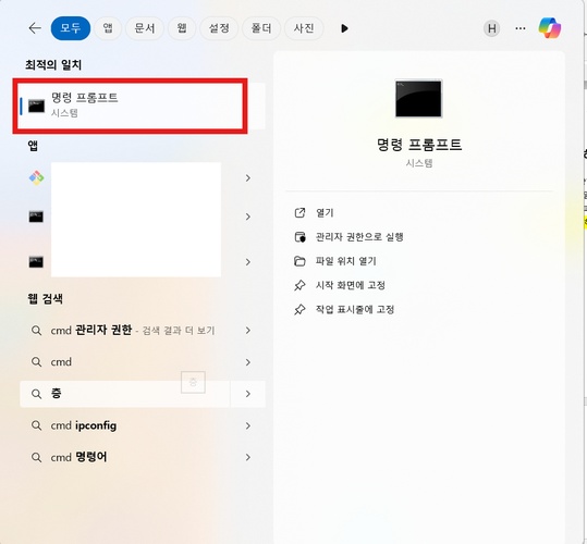 win + s키를 눌러 cmd를 검색하고 관리자 권한으로 실행합니다.