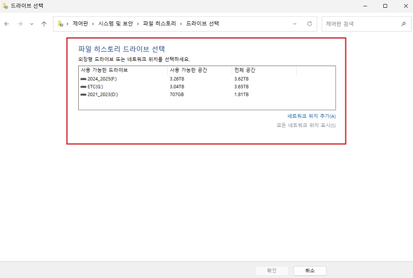 파일 히스토리 화면에서 '드라이브 선택'을 클릭하고, 연결한 외장 드라이브 또는 네트워크 위치를 선택합니다.
