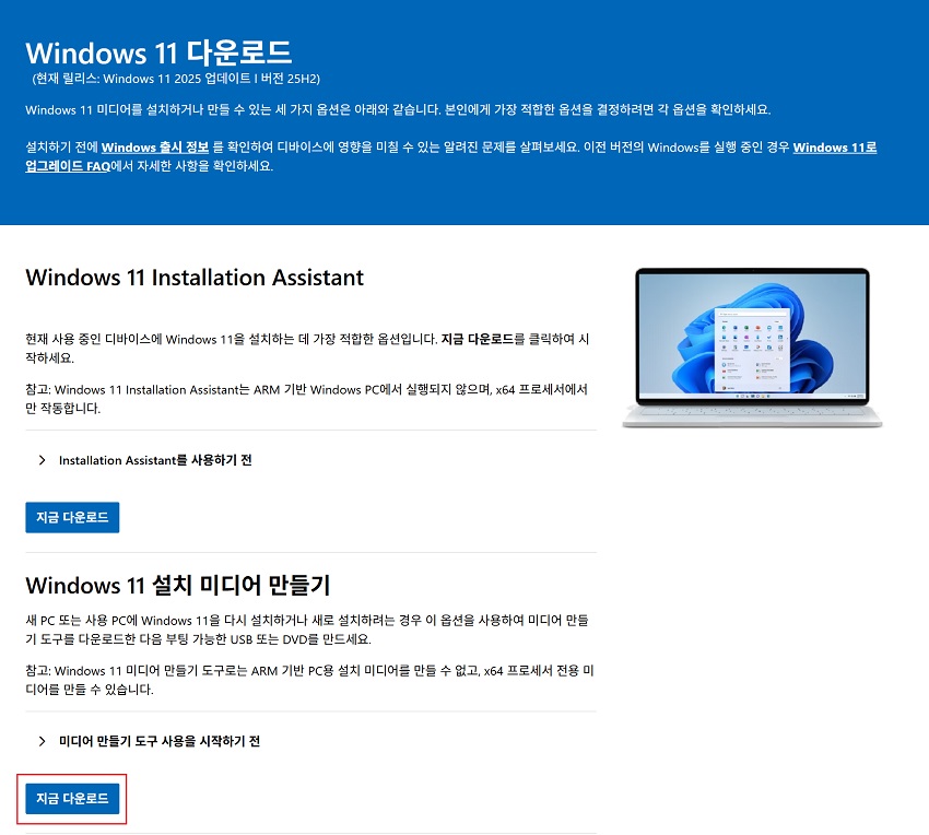 마이크로소프트 공식 홈페이지에서 미디어 생성 도구를 다운로드해 주세요.