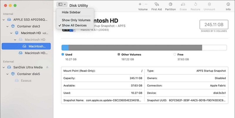 Launch the Disk Utility app on your Mac and choose View > Show All Devices.